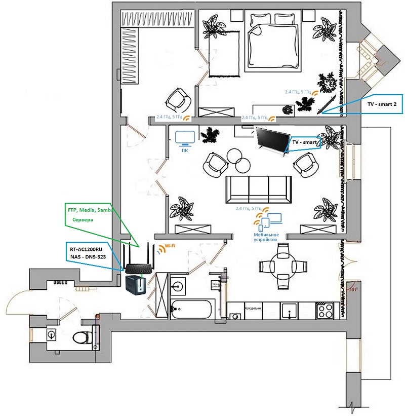Оборудование разместили (как показано на плане) при входе в квартиру. Практически все потребители работают с роутером по WiFi в диапазоне 5 ГГц.