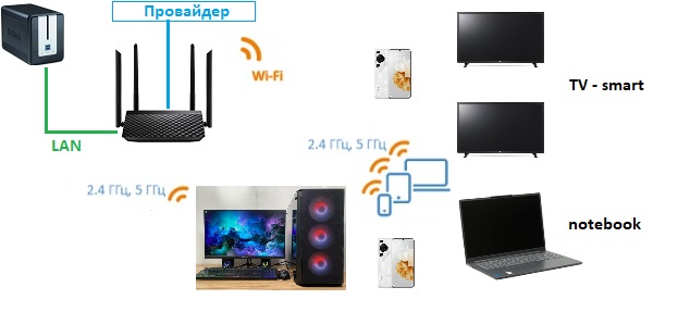 - Обеспечить приемлемую пропускную способность сети при этом сохранить доступ устройств с 2,4 ГГц (Использование двух диапазонного роутера)