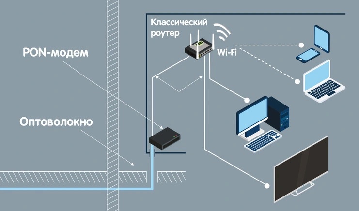 Как видим на картинке, оптический кабель от провайдера подключается напрямую в маршрутизатор, а от LAN-портов вы уже разводите витую пару к устройствам потребления.